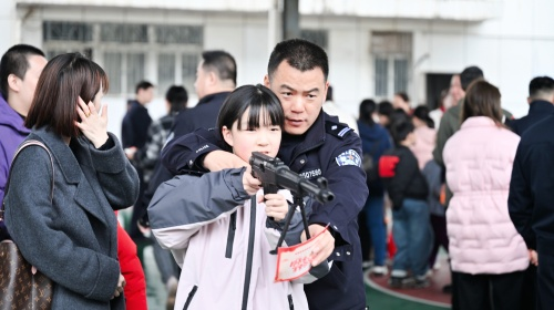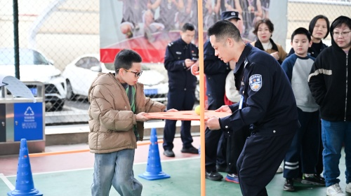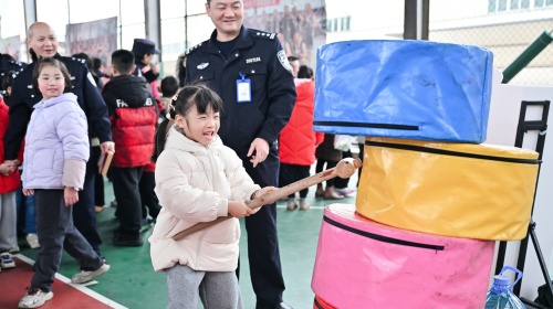 活动现场,处处洋溢着温馨与喜庆的氛围。游园会设置了丰富多彩的趣味游戏项目,既有考验精准度的高尔夫、套圈圈和射击,也有锻炼手眼协调的叠叠乐和丢沙包,更有充满童趣的纸飞机和飞行棋。在“亲子同舟”合作游戏中,家长与孩子默契配合,步调一致,不仅增进了亲子情感,更在协作中传递了团结奋进的警营精神。此外,“拓福”活动区也格外热闹,孩子们在家长的陪伴下,亲手拓印出一个个充满祝福的“福”字,将新年的美好祝愿带回家。