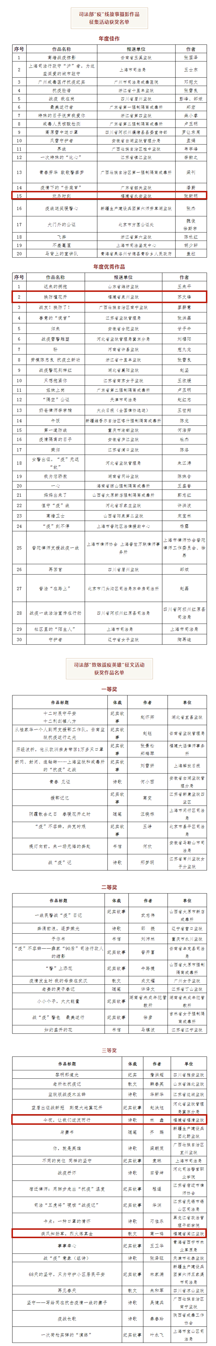 我省监狱系统报送作品《欢乐时刻》(永安监狱 张新明)荣获司法部“疫”线故事摄影作品年度佳作,《换防槿花开》(泉州监狱 苏文锋)荣获司法部“疫”线故事摄影作品年度优秀作品,《今夜,让我们逆流而行》(福清监狱 林鑫)、《疾风知劲草,烈火炼真金》(闽江监狱 高一鸣)荣获司法部“致敬战疫英雄”征文三等奖。