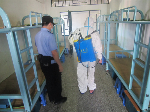 五是抓好内务和环境卫生消杀工作。要求全体罪犯讲究个人卫生,勤洗手,减少或缩短洗澡时间,规范佩戴口罩,提高全体罪犯自我防护意识,保持监舍、车间通风,早晚两次使用533消毒液对监舍、车间及重点部位进行消杀,调配紫外线灯进行照射消毒。
