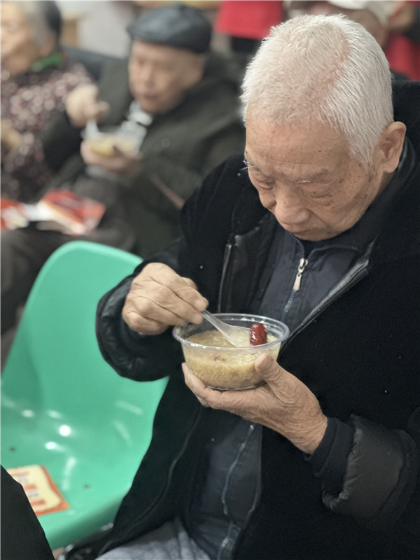 正月二十九煮“拗九粥”孝敬双亲及邻里长辈,已相沿成俗并广为流传。一大早,静安养老公寓便飘散着香甜的味道,一碗刚出炉的“拗九粥”,热气腾腾,糯米的清香、红枣与桂圆的甘甜、荸荠的清脆、莲子的粉糯,糅合成一碗浅琥珀色甜粥。一监区的民警们将一碗碗暖乎乎的“拗九粥”递到老人手里,“好甜,哈哈,心也很甜”“我有点高血糖,但这个必须吃一口,吃一口幸福长长久久”……其乐融融的氛围中,仿佛人们呼吸里都有温暖的红糖味。