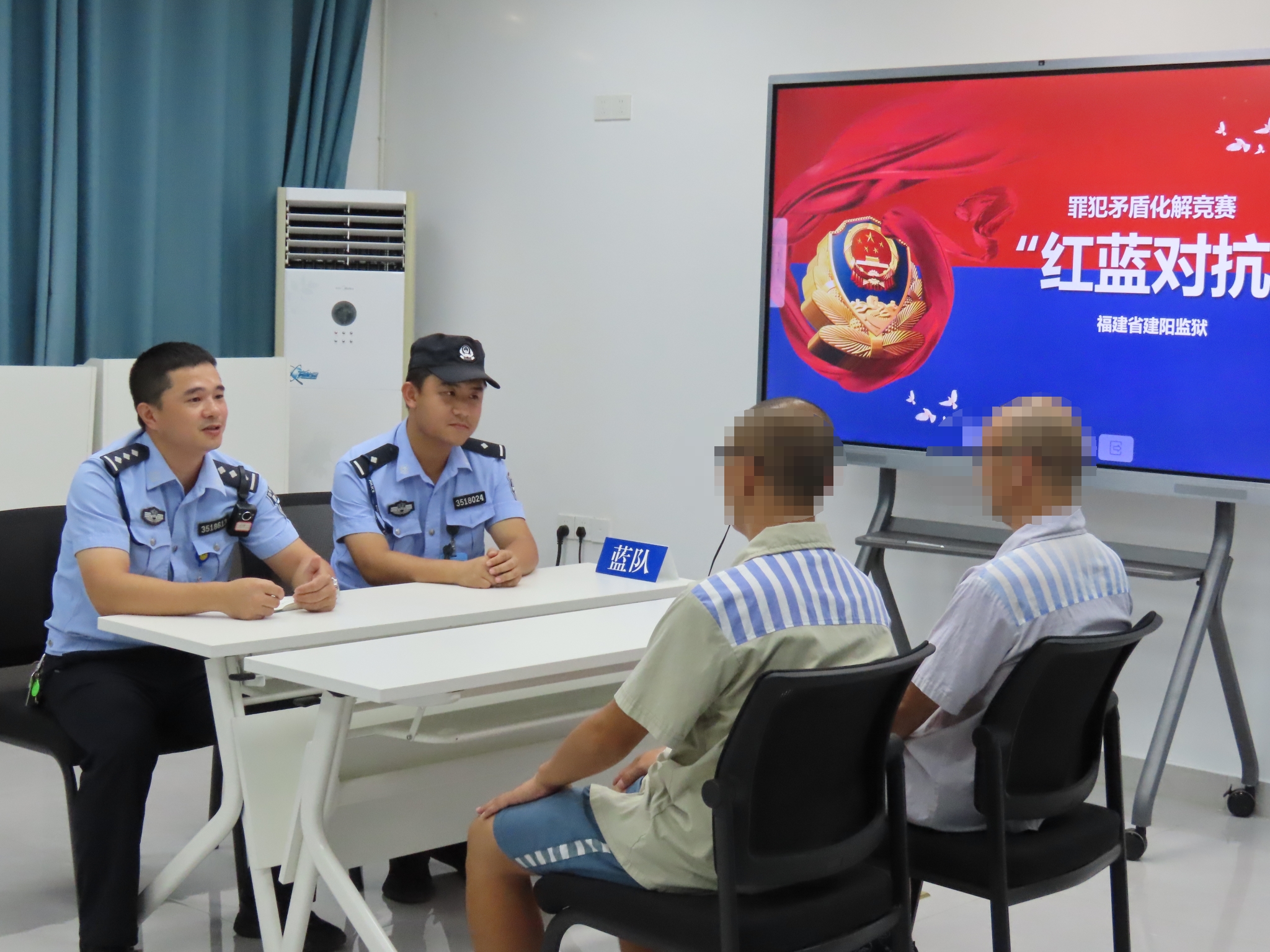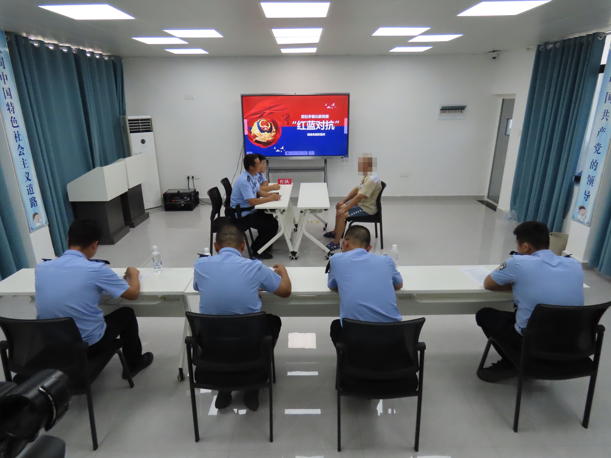赛前,监狱教育改造科通过实景拍摄了罪犯在车间、号房、卫生间以及看新闻时因琐事引发矛盾纠纷的四个典型案例,并进行现场播放。来自不同监区的16位民警通过抽签组成4个“红蓝对抗”小组,其中红方和蓝方各2名,考核时每个小组针对同一个罪犯矛盾纠纷案例,红蓝双方民警现场分别对当事罪犯进行谈话教育。