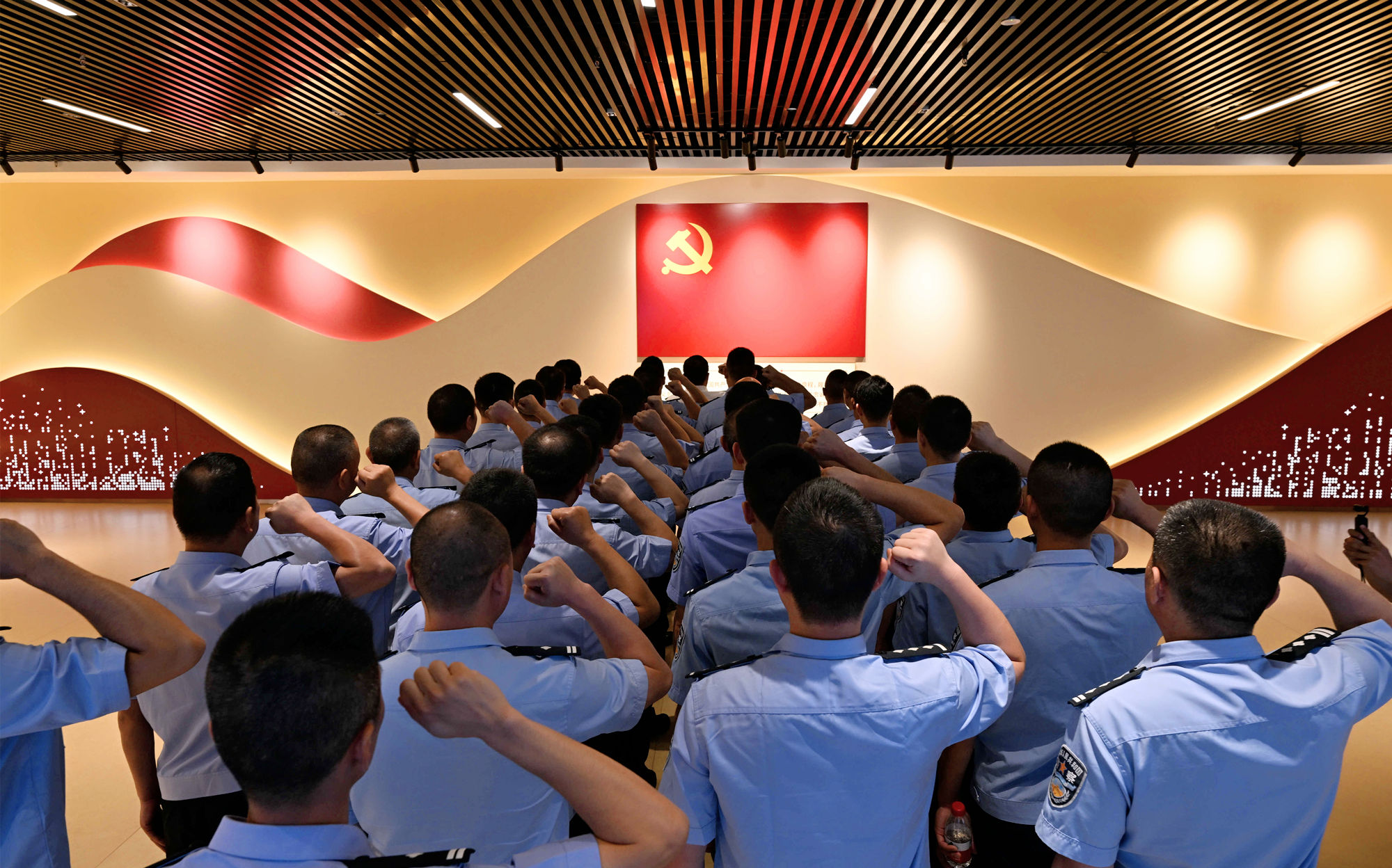 在现场教学中,学员们还面向党旗、举起右拳重温入党誓词,铿锵有力的誓言充分昭示大家坚定理想信念、严格履行职责、致力改造主业、保障安全稳定,奋力谱写监狱发展新篇章的坚定决心。