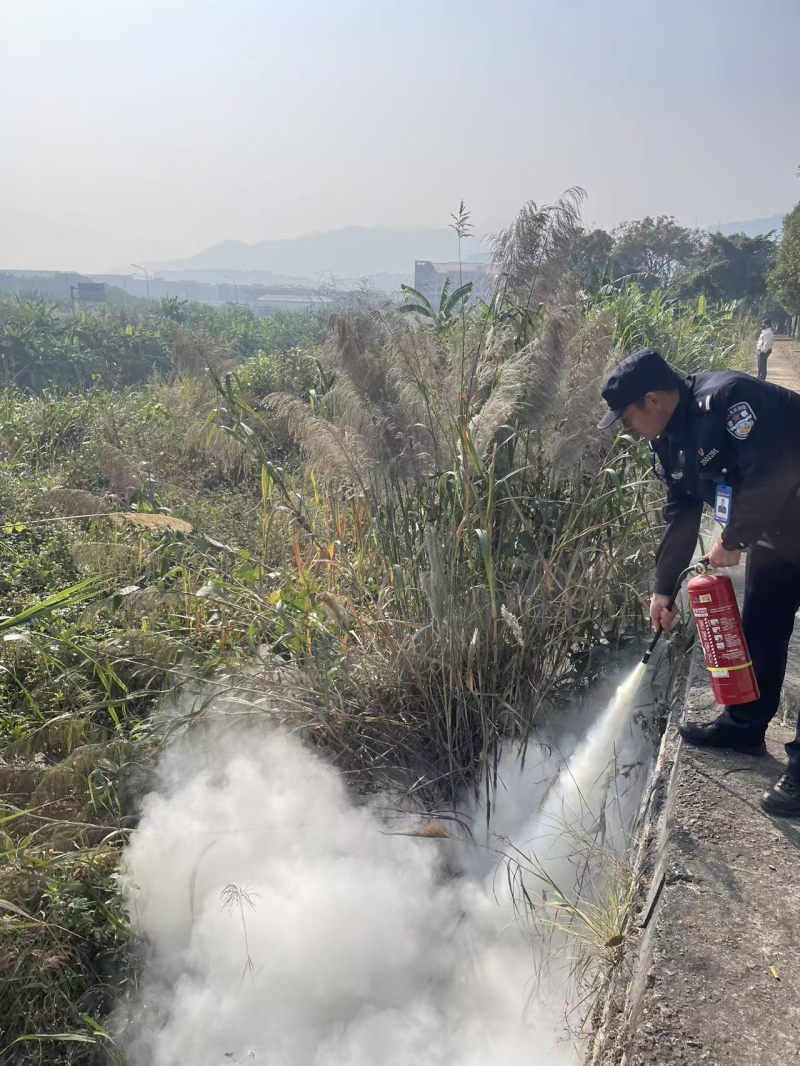 八监区民警黄锦鑫在便民服务中心执行秩序维护任务时,敏锐发现附近河岸边杂草堆出现冒烟迹象。他反应迅速,立即向指挥中心报告情况,并就近取出灭火器前往事发点进行先期扑救。