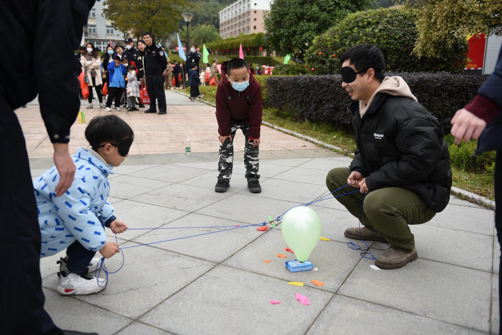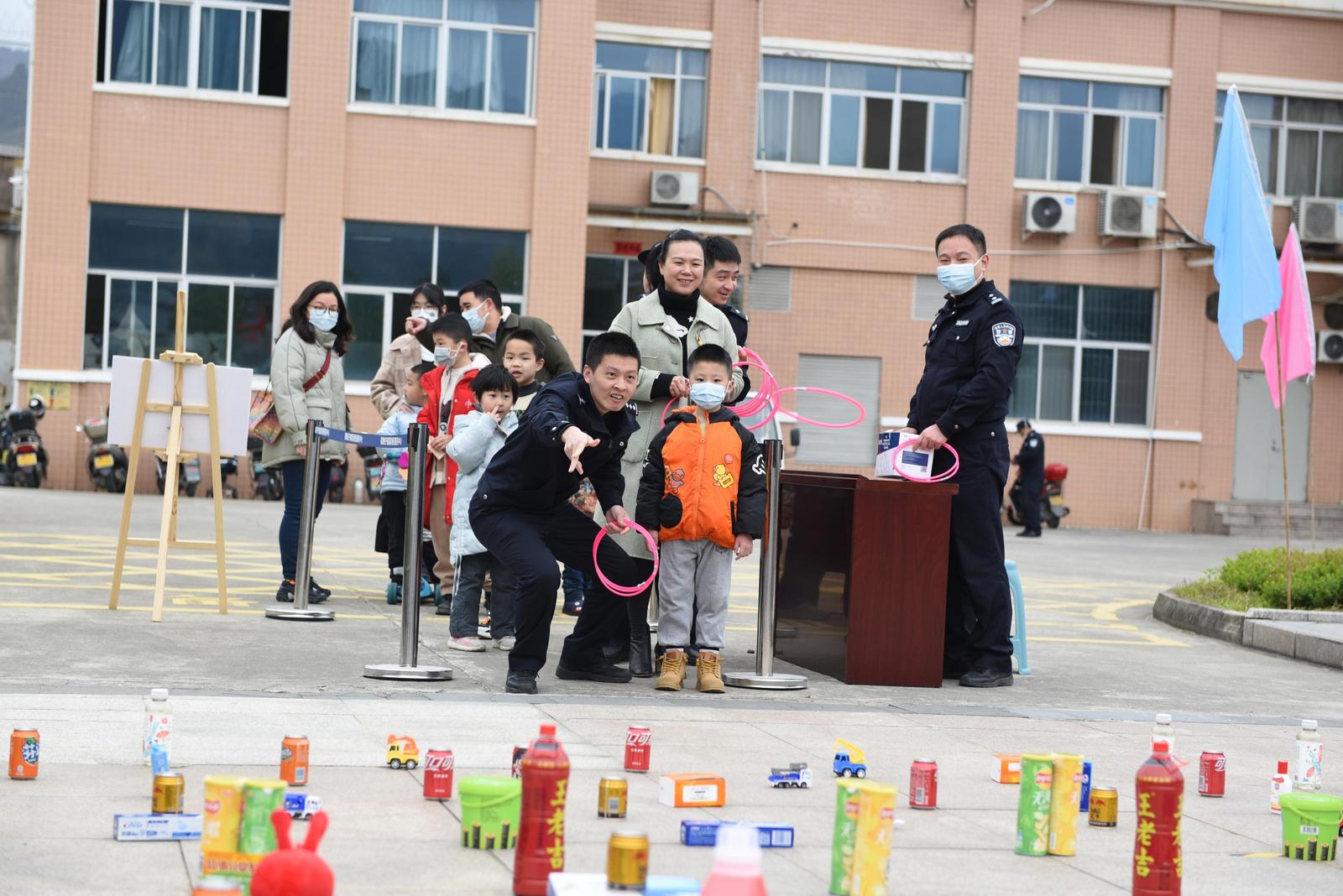 “哈哈哈……中了,中了!”“太厉害了!”,突然,从“套圈”游戏现场传来一片欢呼声,原来是民警小赵套中了一个实用的电饭煲,他的脸上充满了喜悦,大家都很羡慕他。而另一边的小朋友也在欢呼雀跃,有的套中心仪的玩具和零食;有的顺利引爆“地雷”;有的临门一脚进球得分……