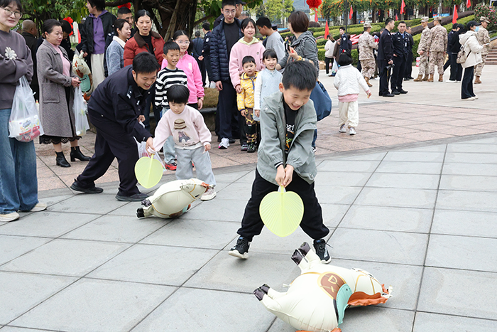 在“福马探宝”区,警宝们三五成群,弯腰搜寻藏在角落的“小宝物”,每找到一个便欢呼雀跃地奔向兑奖处;“马蹄飞燕”套圈区,参与者屏息凝神,一掷即中,赢得阵阵喝彩;“马到成功”游戏里,大家用扇子将充气小马赶入“成功门”,场面既紧张又逗趣,笑声不断。一旁的“金马飞盘”“瑞马投福”同样人气爆棚,大家纷纷化身“神投手”,瞄准、发力、命中,一气呵成。