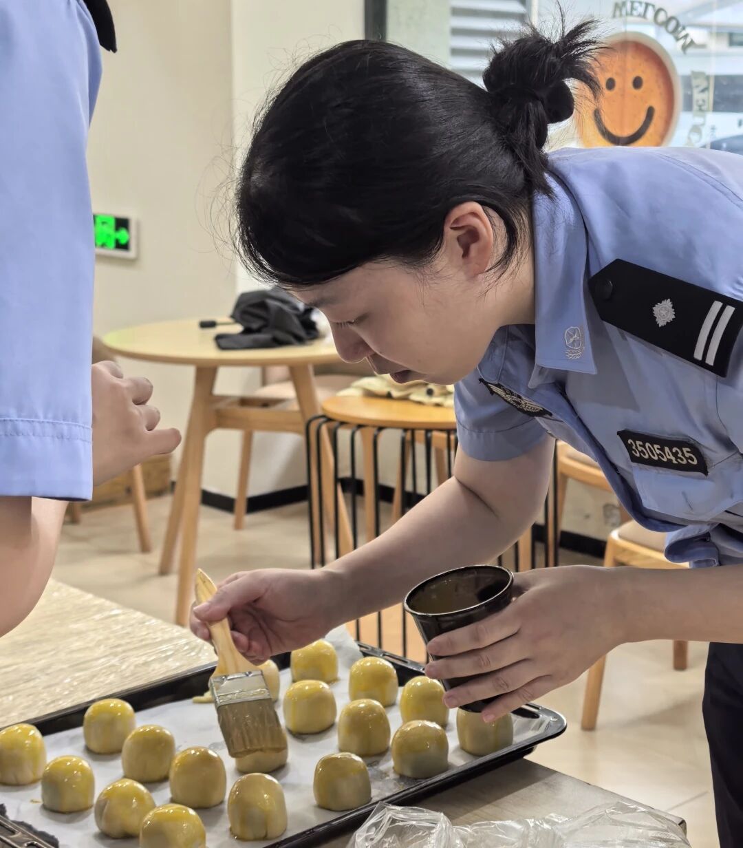 恰逢双节将至,民警们在挑选食材时,更添了一份对 “节日清廉” 的思考:面粉的纯净,象征着思想的纯粹,佳节期间更需警惕 “人情往来” 中的贪腐杂念;黄油的纯正,代表着作风的端正,不能被节日 “宴请送礼” 的诱惑所污染;蛋黄的饱满,寓意着担当的充实,即便身处假期,也不能忘记为民服务的宗旨。每一份精心挑选的食材,都是民警对 “廉洁过节、清白从警” 承诺的无声践行。