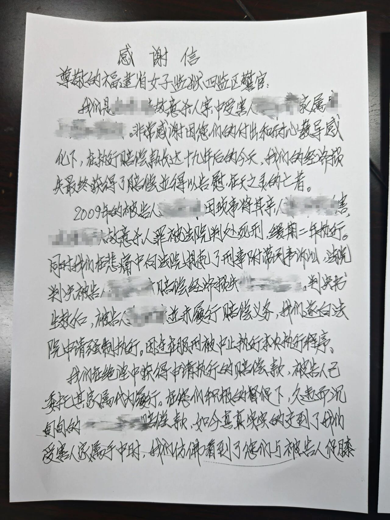 “我们深知,这场悲剧给您带来了巨大的痛苦和无法挽回的损失……哪怕不原谅,也希望你能知道我们的歉意。”在监狱民警、法院执行法官和律师的共同协调下,10月20日,王某家属带着赔偿款和道歉信,在泉港法院执行局的调解室里见到了张某家属。张某家属不禁红了眼眶:“她能真正认识自己的错,就当是给我父亲的在天之灵一个交代。”