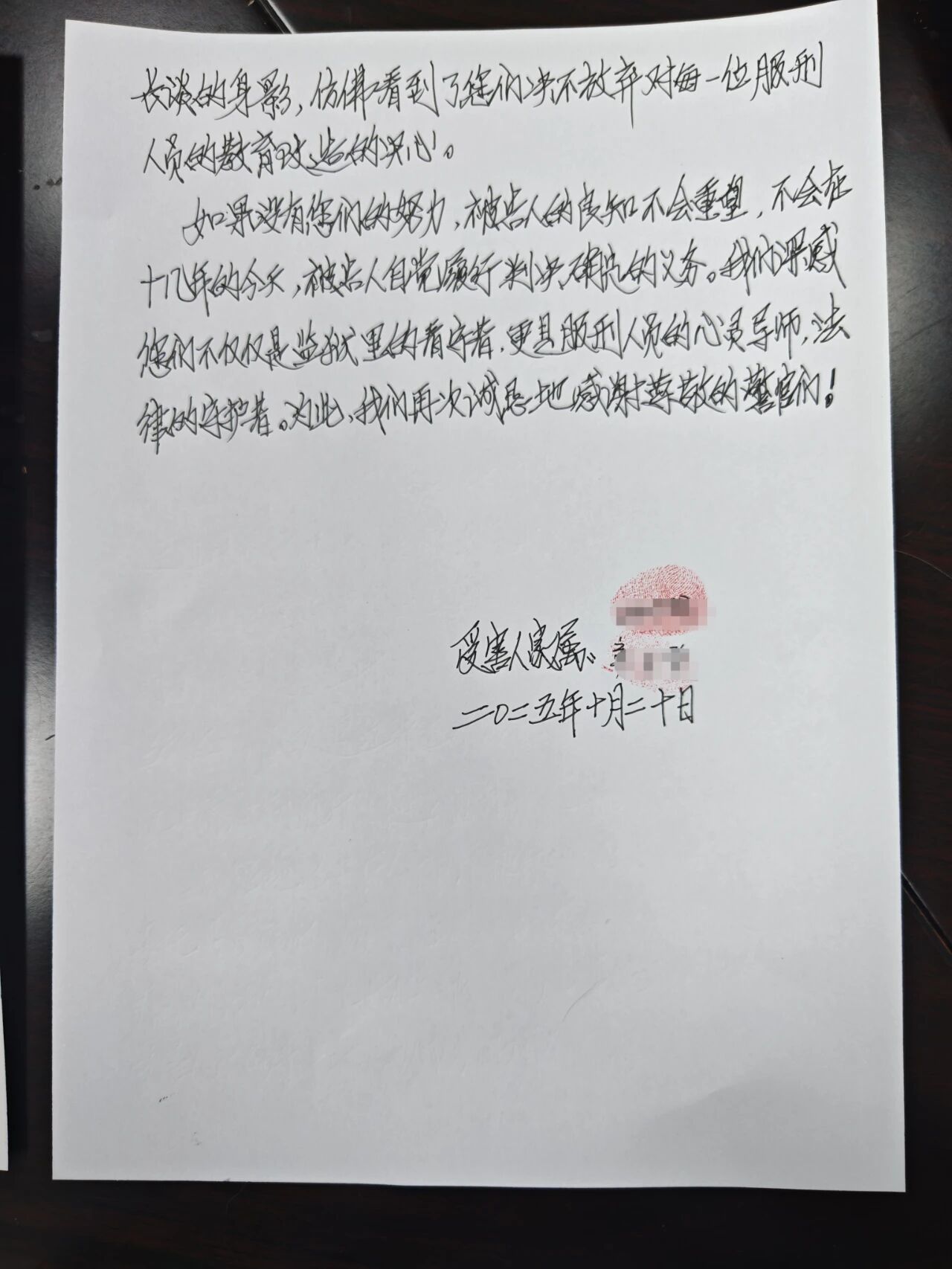 重建王某与家人的联系,是改造的关键。可王某的子女对她心存怨怼。分监区民警没放弃,多次联系王某户籍所在地司法所、村委会和派出所,带着她的认罪悔罪书和改造笔记反复沟通,终于让女儿动容:“她在监狱好好改造,我会做通家人的工作,去看看她。”