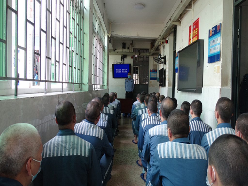执勤民警组织罪犯分享感想,稳固教育成果,唤醒大家的爱党爱国热情,提振改造信心和决心。
