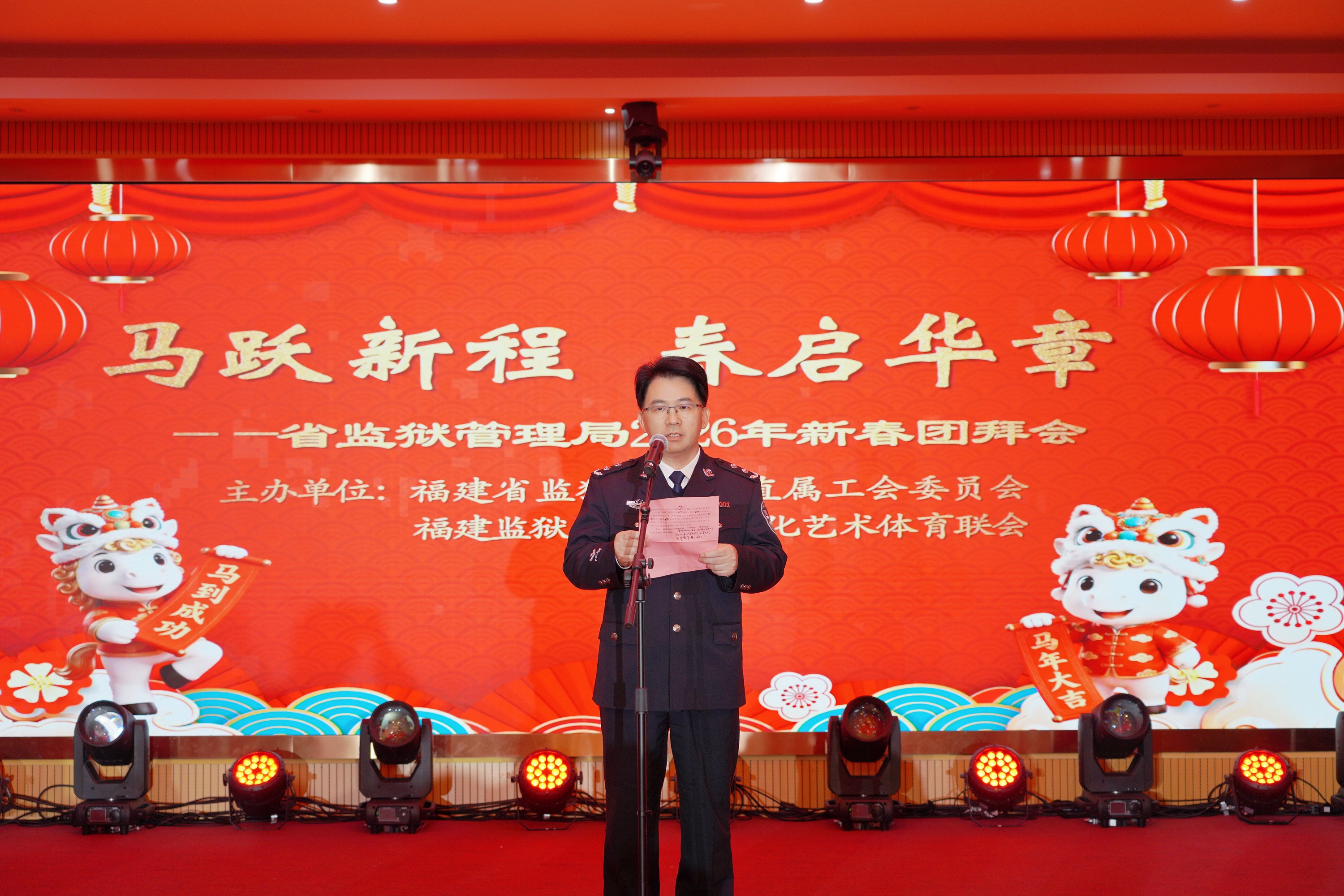 省司法厅党委委员、监狱管理局党委书记、局长钟火阵发表致辞,向长期以来关心支持福建监狱工作发展的各级领导、各界人士表示衷心的感谢,并带领局党委班子成员向全省监狱民警职工及家属、离退休老同志、驻监武警官兵、驻监检察官拜年,致以节日的问候和诚挚的祝福!