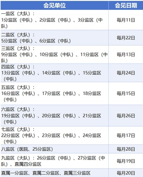 请家属提前核对会见日期与监区信息,携带齐全证件,合理安排行程。监狱将持续优化会见服务,如有政策调整将第一时间通过官方公众号发布,敬请关注。