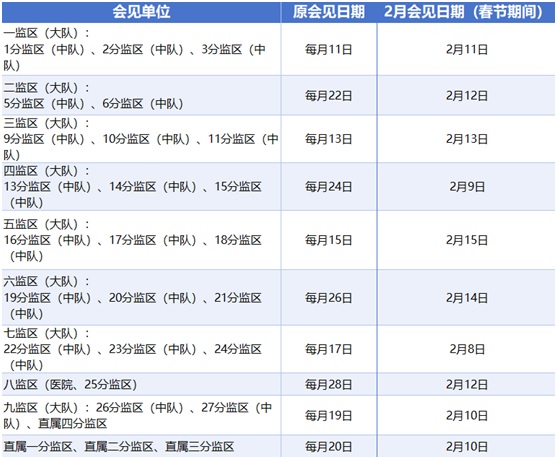 因2026年2月17日为春节(农历正月初一),部分原定会见日恰逢假期,为保障家属顺利会见,现将2月份相关监区会见日调整如下: