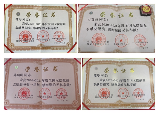 “要么不做,做了就要做得最好”是陈峥同志的奉献格言,累计献血量达7200CC,每年都有人因为他的血转危为安,从而获得生命的延续;叶贤蔚同志在工作之余热心公益事业,在2003年首次参加无偿献血活动中得知自己是RH阴性O型血即“熊猫血”,此后便加入了无偿献血队伍中来,先后捐献全血2800CC,8次单采血小板14个治疗量,获得福建省血液中心表彰;林海同志始终坚持“奉献、有爱、互助、进步”的志愿精神,将爱心的种子播撒到每个角落,曾获“全国监狱工作先进个人”荣誉称号。十多年来默默捐献热血,献血量达7400CC之多,相当于两个成年人体内血量的总和。
