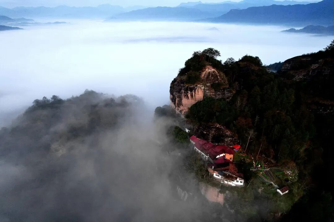 云雾漫上山腰,给丹崖翠谷披上一层轻纱。云雾掠过之处,红叶更艳,竹影更幽。远处的山峰在云雾中若隐若现,像是一幅晕染的水墨画,既有冬的清寂,又有秋的绚烂。这般景致,让人恍惚,不知是秋不愿离去,还是冬不忍惊扰。