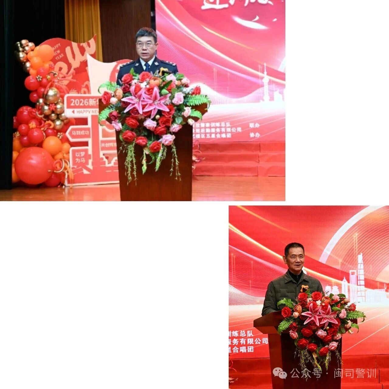 随后,训练总队党委书记、总队长、二级警务专员林革发表新春致辞,向出席团拜会的领导、同志们拜年,并致以最诚挚的节日祝福和美好的新春祝愿。他表示,过去一年训练总队在培训、教学、科研等方面取得了丰硕的成果,肯定了全体民警职工凝心聚力、真抓实干的奋进姿态。同时对新一年的发展寄予殷切期望,勉励全体民警职工以龙马精神砥砺前进、以奋进之姿勇毅笃行,在“十五五”规划新征程的起步之年奋力谱写总队事业高质量发展的崭新篇章!五星合唱团团长吴安通也上台作了热情洋溢的致辞,预祝演出圆满成功,祝愿大家新春快乐!