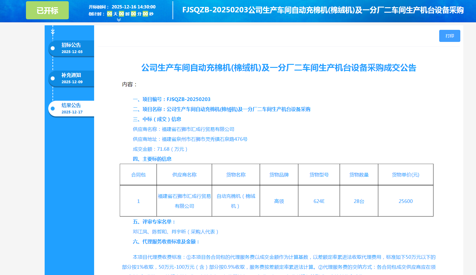 公司生产车间自动充棉机(棉绒机)及一分厂二车间生产机台设备采购成交公告