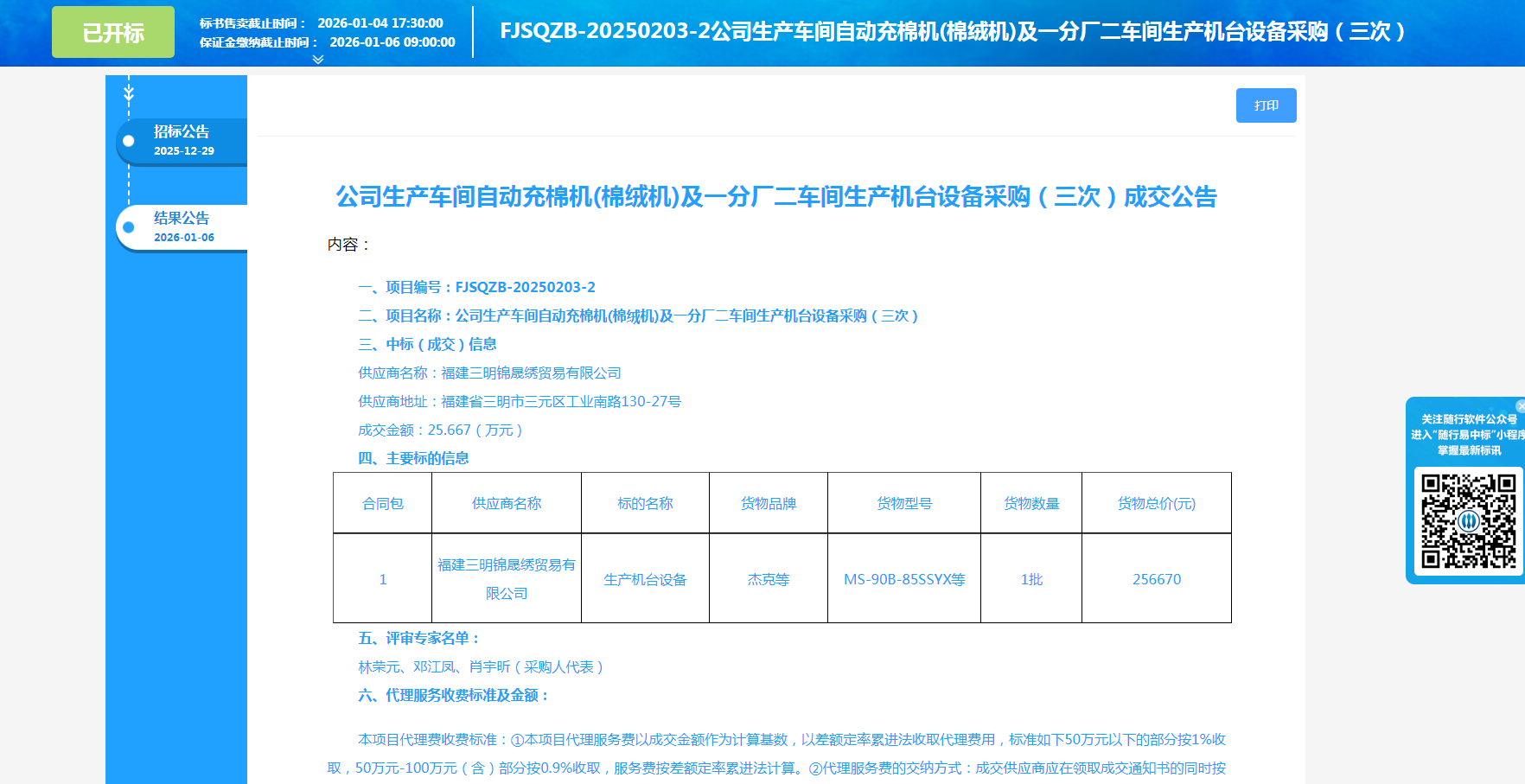 公司生产车间自动充棉机(棉绒机)及一分厂二车间生产机台设备采购(三次)成交公告
