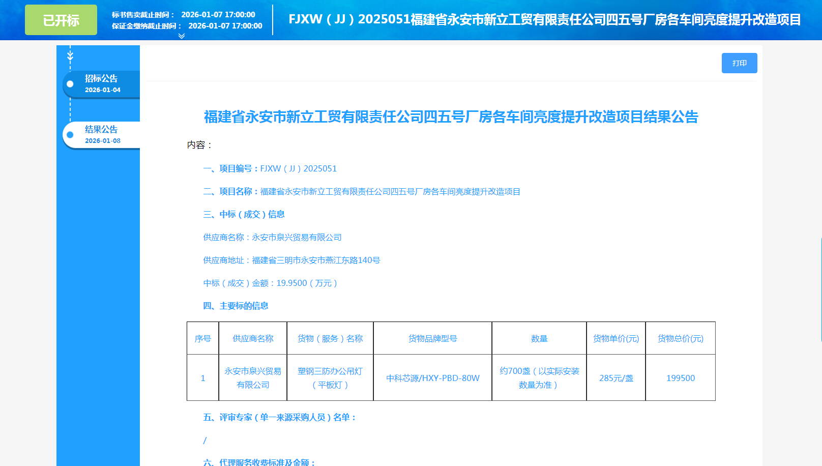 福建省永安市新立工贸有限责任公司四五号厂房各车间亮度提升改造项目结果公告