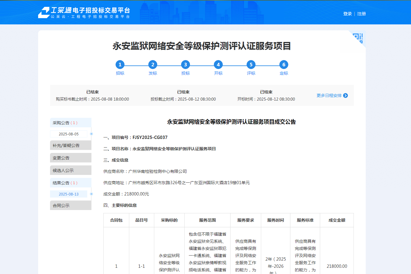 永安监狱网络安全等级保护测评认证服务项目成交公告