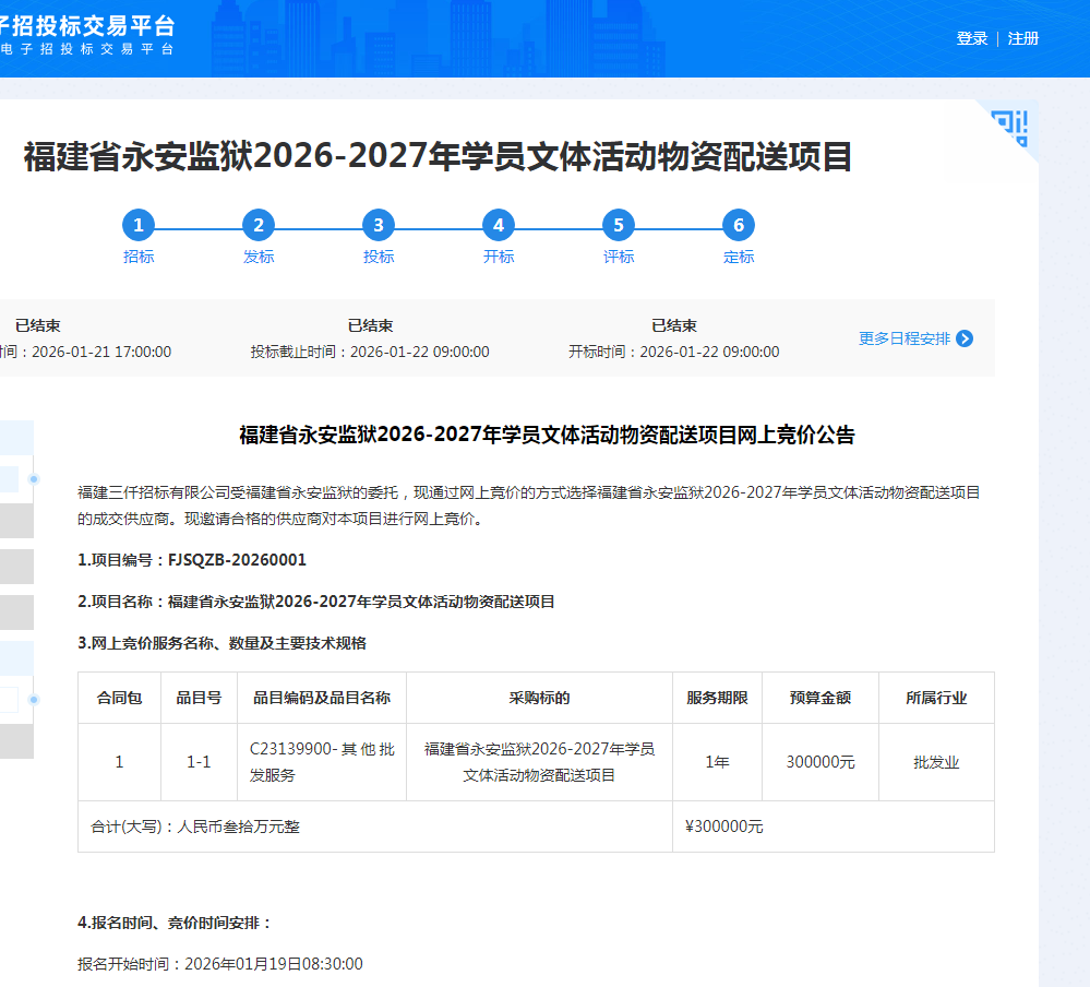 福建省永安监狱2026-2027年学员文体活动物资配送项目网上竞价公告