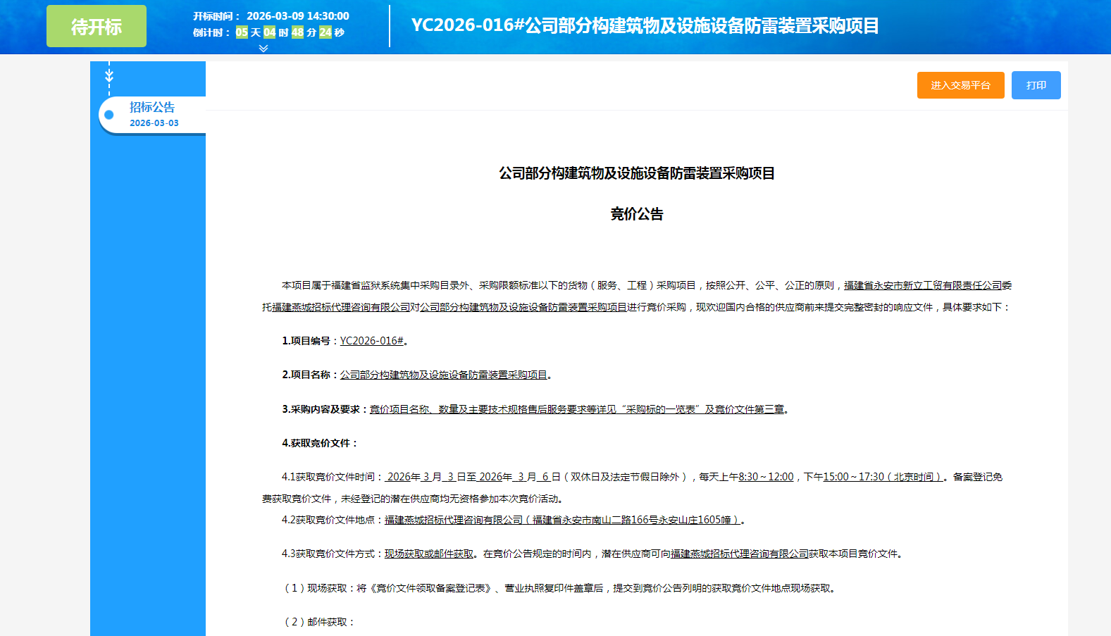 公司部分构建筑物及设施设备防雷装置采购项目竞价公告