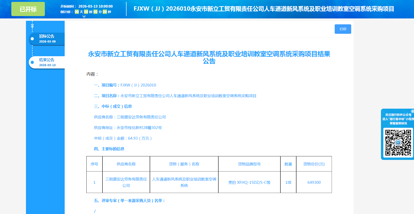 永安市新立工贸有限责任公司人车通道新风系统及职业培训教室空调系统采购项目结果公告