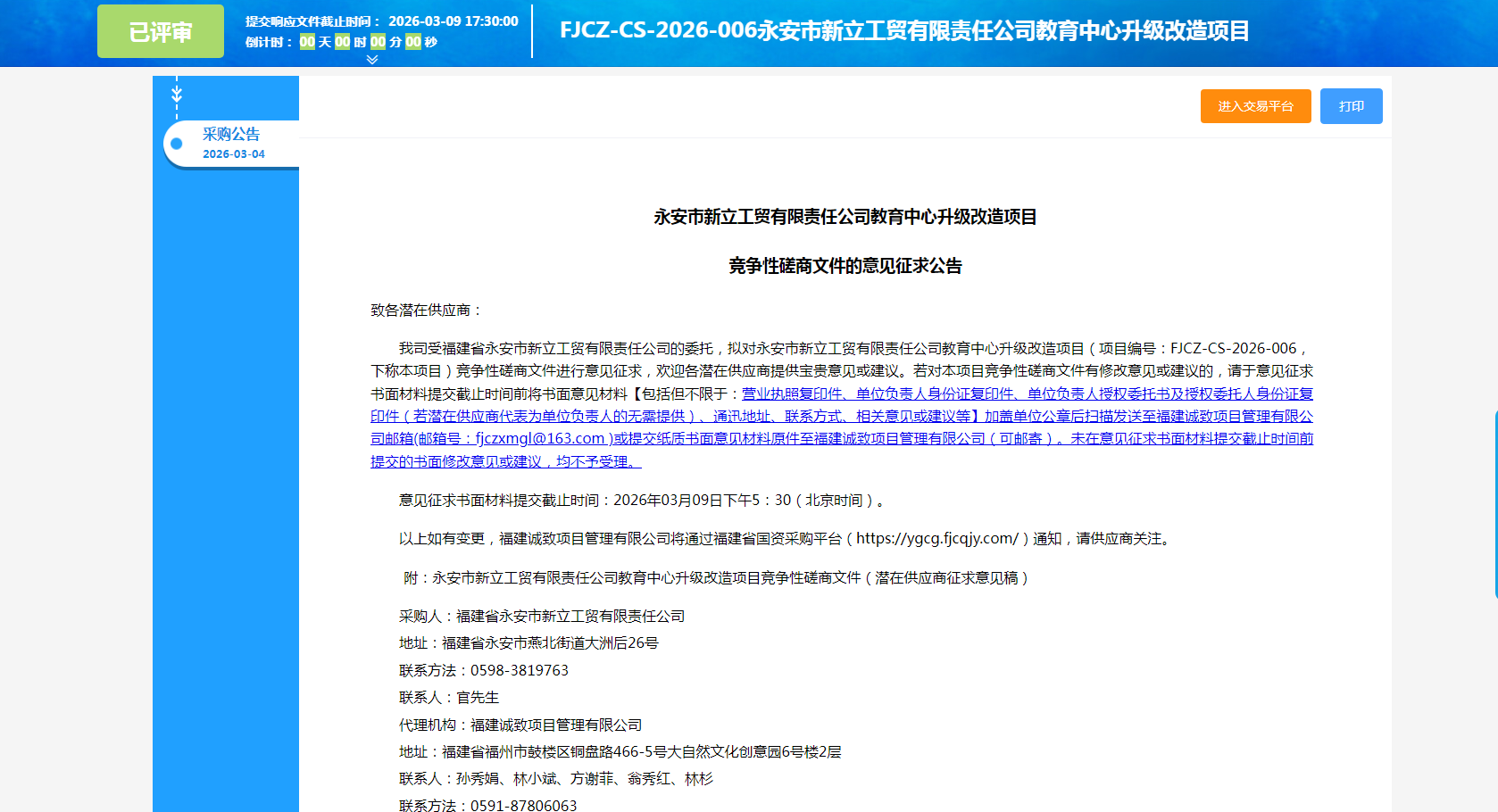 永安市新立工贸有限责任公司教育中心升级改造项目竞争性磋商文件的意见征求公告