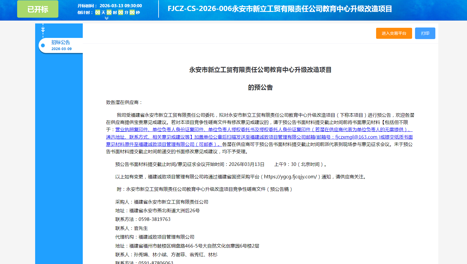 永安市新立工贸有限责任公司教育中心升级改造项目的预公告