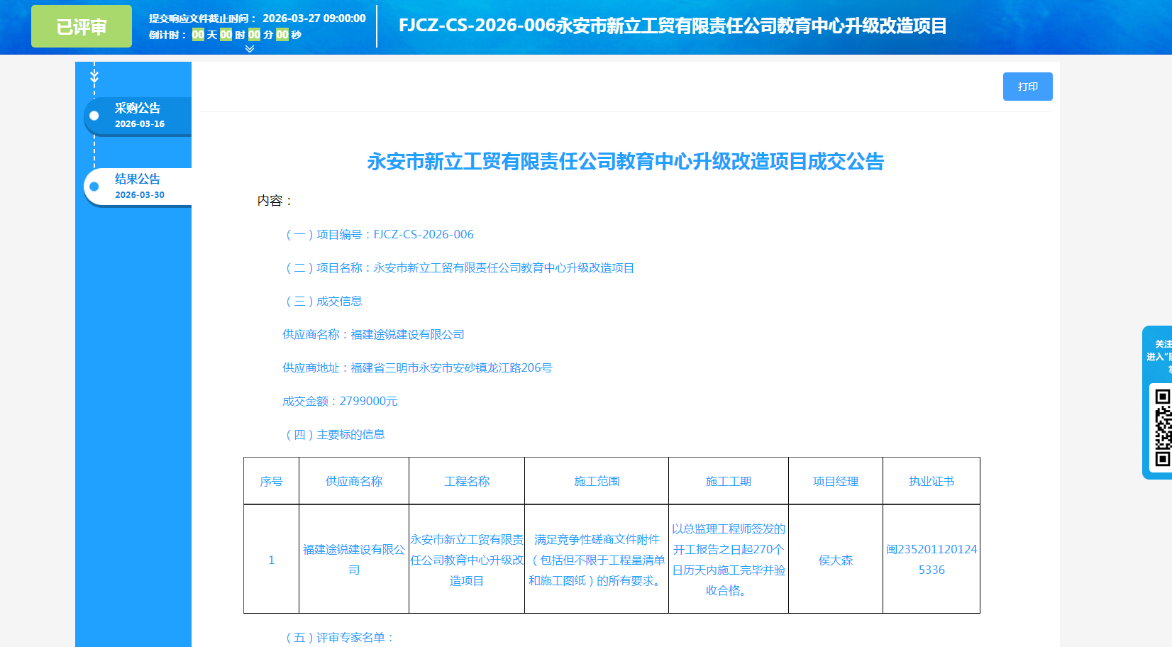 永安市新立工贸有限责任公司教育中心升级改造项目成交公告