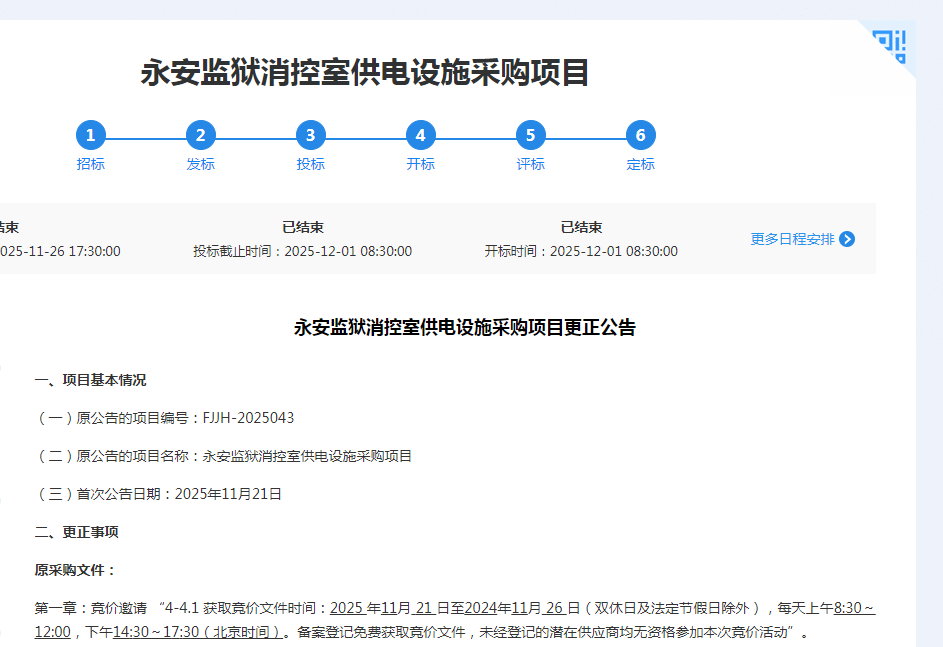永安监狱消控室供电设施采购项目更正公告