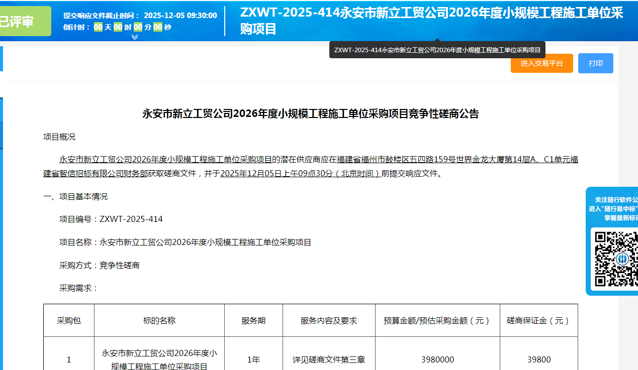 永安市新立工贸公司2026年度小规模工程施工单位采购项目竞争性磋商公告