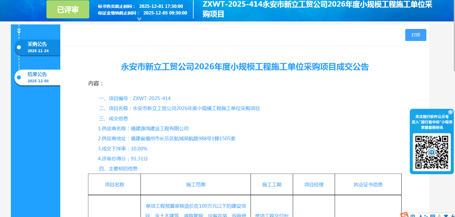 永安市新立工贸公司2026年度小规模工程施工单位采购项目成交公告
