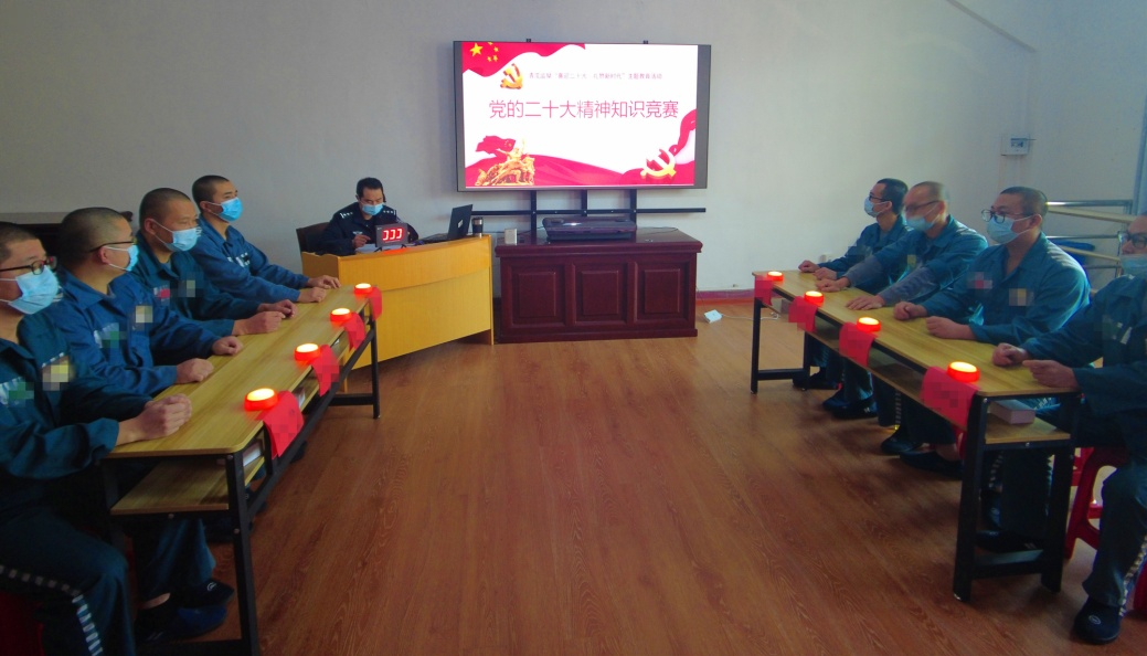 通过组织罪犯观看媒体报道、学金句、讨论会、红歌传唱、红色故事会、观看红色影视等形式,围绕红色文化主题,开展形式多样、丰富多彩的“学习二十大 礼赞新时代”教育活动,将党的二十大精神与改造相结合,教育引导罪犯进一步树立爱党爱国爱社会主义之情,营造浓厚热烈、安全稳定、积极向上的改造氛围。