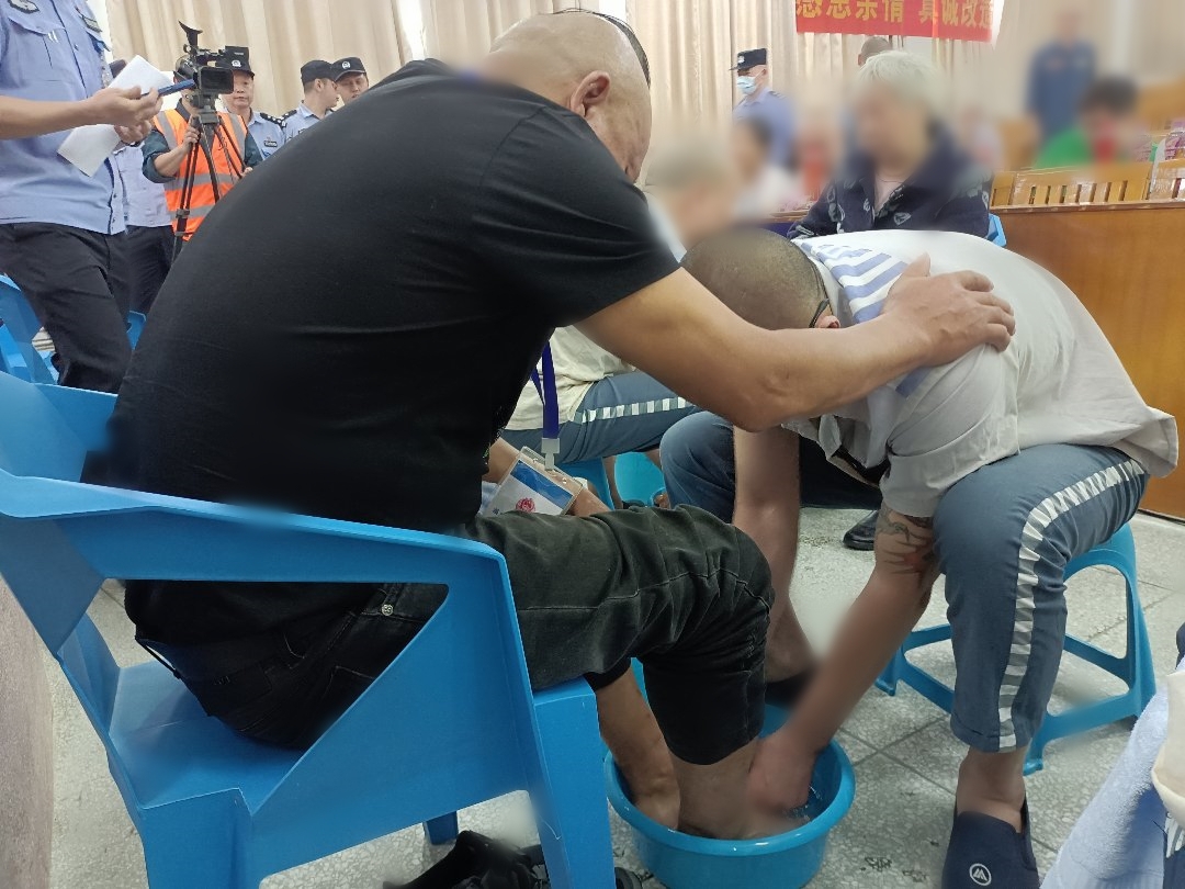 罪犯杨某为老父亲洗脚时,泣不成声,哽咽着对父亲说道:“对不起,我没能做个孝顺的儿子。”父亲对儿子说:“你在这里要好好改造,争取早日出来,家里人会等你出来。”