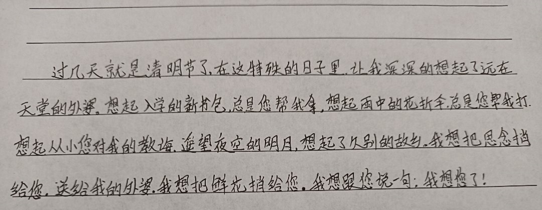 待我明年回家后,在到您墓前磕头祭拜。今年,我只能以信之媒,将对您的思念寄往天堂,以慰您在天之灵。
