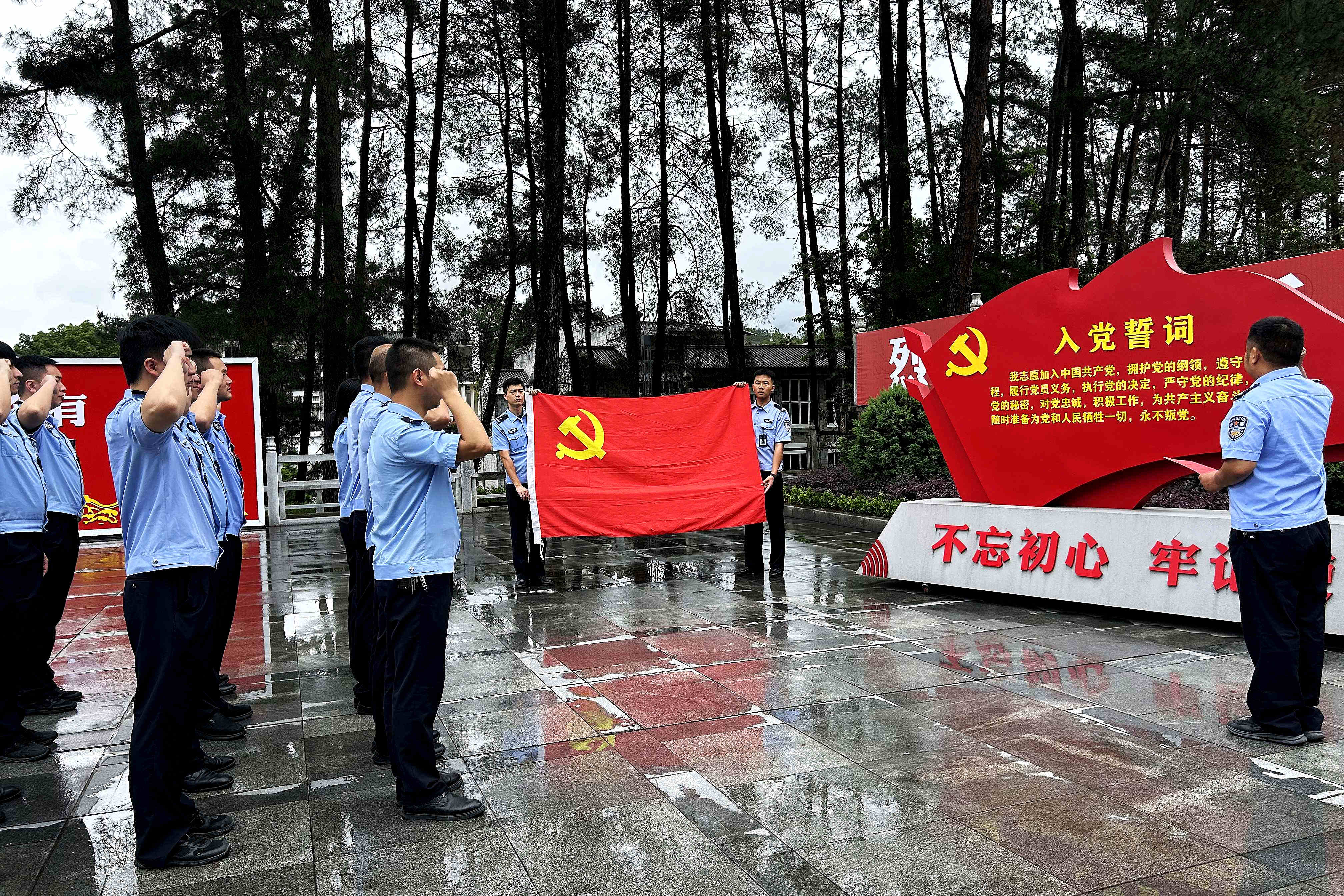 在新四军赤石暴动纪念馆,党员民警们怀着崇敬的心情,走近一面镌刻了73名在武夷山牺牲的烈士姓名的烈士墙。他们当中,年龄最大的40岁,最小的只有18岁。站在纪念碑前,全体党员民警仰望英雄的丰碑,向赤石暴动牺牲的革命烈士们敬献鲜花、默哀鞠躬,以此寄托最深切的缅怀和最崇高的敬意。随后,全体党员高举右手,面向党旗,重温入党誓词。“在烈士丰碑前完成入党宣誓仪式,我倍感荣幸,作为一名刚入党的党员,在以后的工作中,我要提醒自己时刻以革命先辈们的精神要求自身,奋力为党和监狱事业的发展建设做出更大贡献。”新入党的民警金宸煊说道。