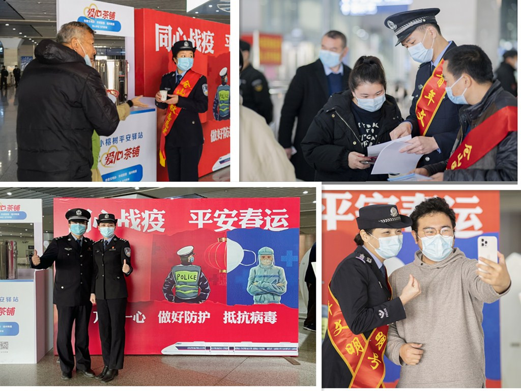 志愿者在火车南站候车大厅设立春运志愿服务点,为来往的旅客提供咨询、乘车指引、办理网上订票、防偷骗安全宣传、防疫知识宣传等服务。他们为步履匆匆的旅客端上热气腾腾的茶水,还向旅客派送春联、福袋、福茶等礼品,为旅客送上新春的祝福,愿平安和幸福与旅客一路相伴。