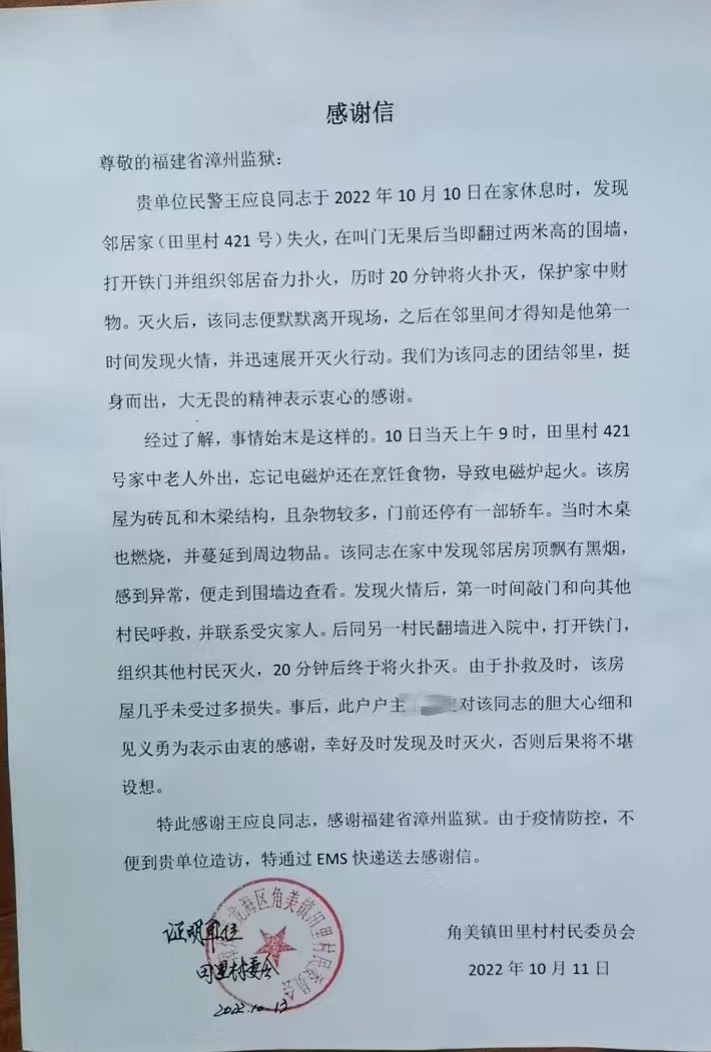 正在居家备勤的漳州监狱一监区二分监区的副政治指导员王应良看到黑烟后,出于职业敏感性,赶忙跑到邻居家围墙边查看,发现火情后立马敲门,却无人响应,于是便一边呼救一边和另一位村民翻墙进入院中,打开院门组织村民们一起灭火。经过20多分钟的努力,终将火势扑灭。由于扑救及时,本次火情仅烧毁了桌子、烧黑了墙壁,房屋未受过多损失。事后,失火户主王先生对王应良胆大心细、见义勇为的精神表示由衷的感谢。