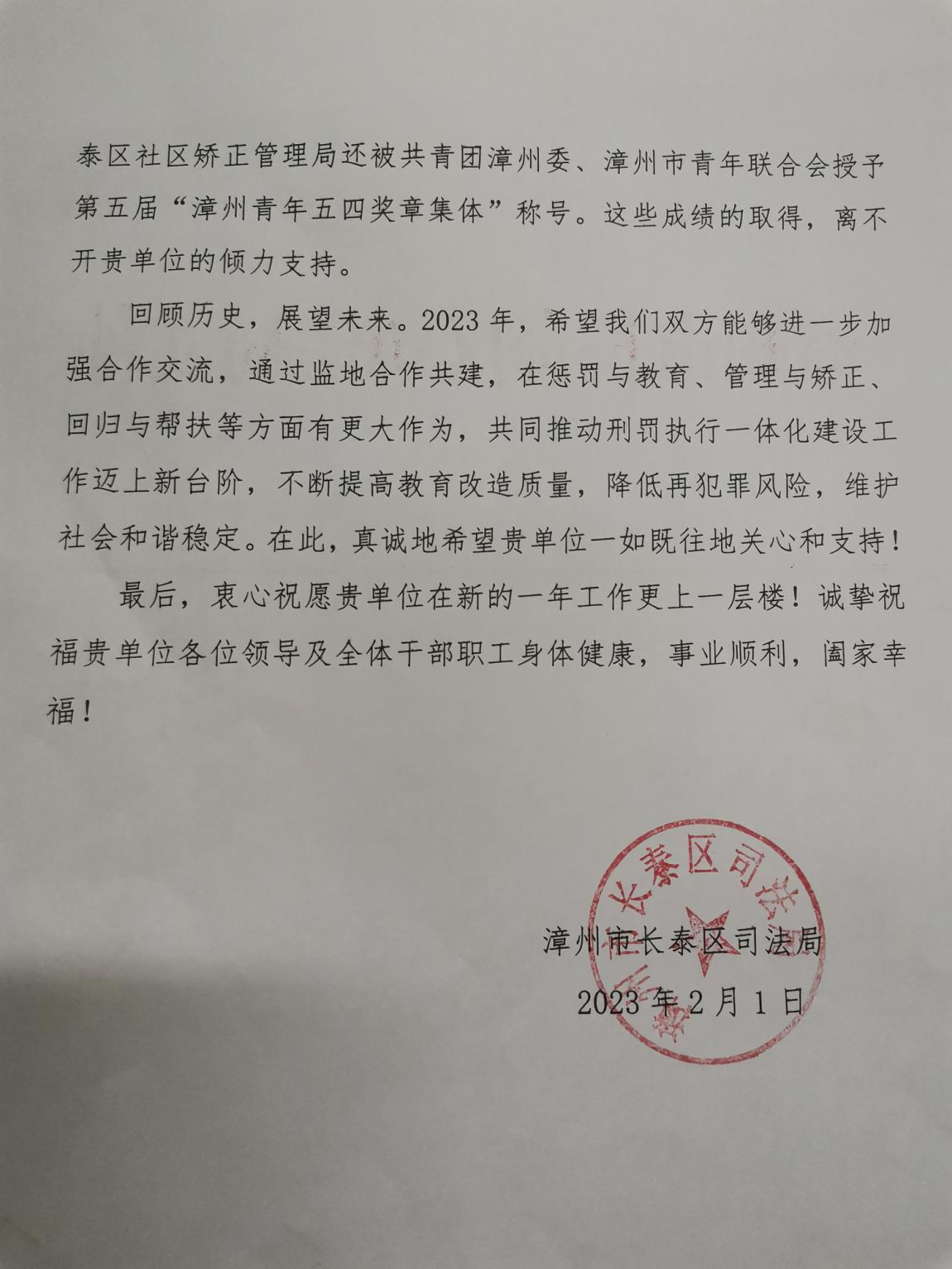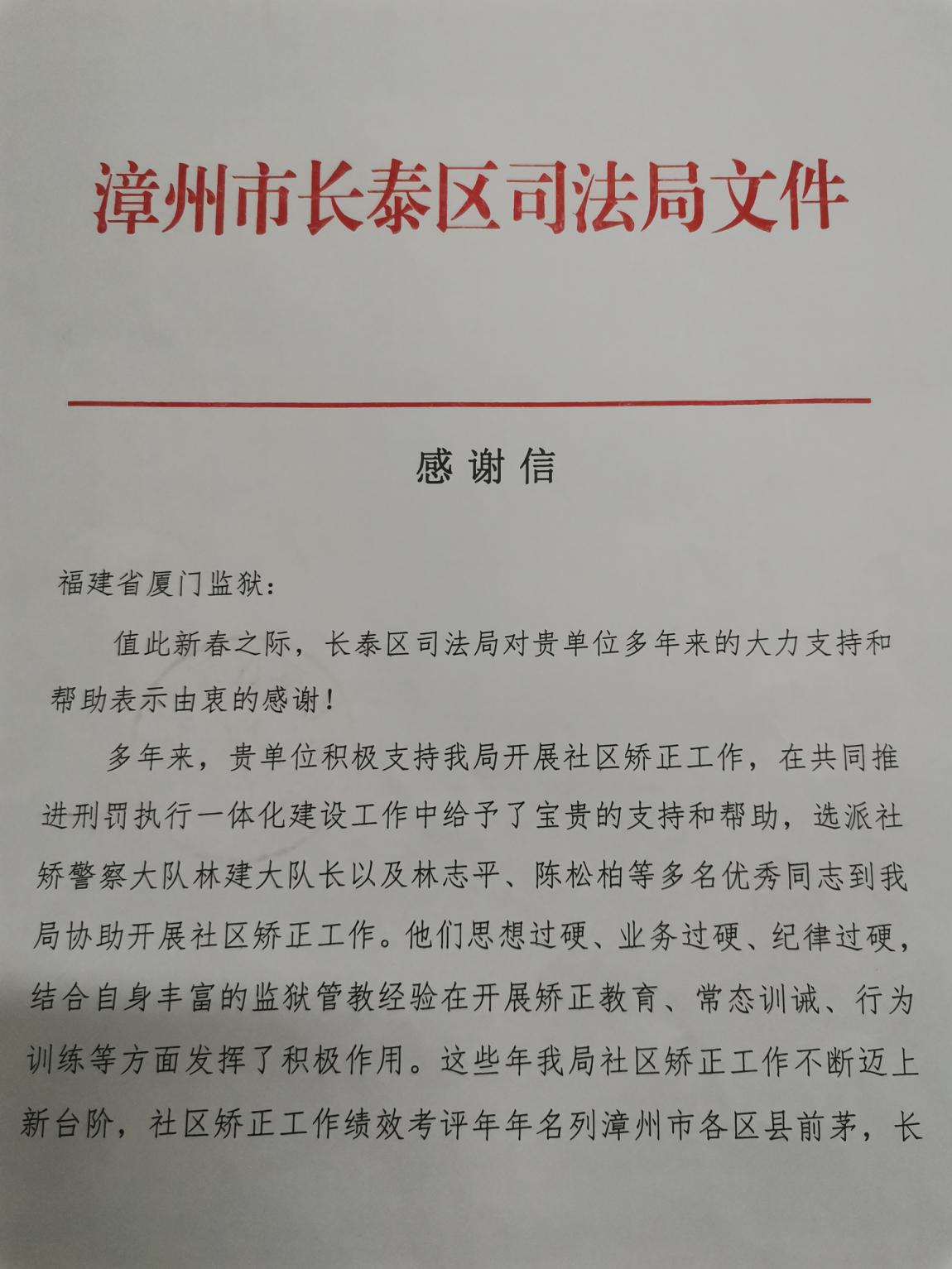 长泰区司法局在感谢信中写道:多年来,厦门监狱积极支持我局开展社区矫正工作,在共同推进刑罚执行一体化建设工作中给予了宝贵的支持和帮助,选派林建、林志平、陈松柏等同志到我局协助开展社区矫正工作,发挥了积极作用。