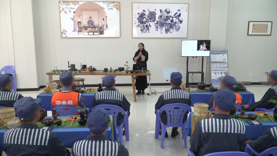 “中华五千年的文明史中,中国人利用茶叶的记载已经四千多年,更是古丝绸之路上重要的商品,与瓷器、丝绸一起,成为中国的象征。”国家高级茶艺师、国家高级评茶员、宋代点茶师导师吴梅老师进监授课时,向参训罪犯多方面诠释了中国茶文化的悠久历史和实用价值。课上,吴梅老师还进行了现场演示,优雅而具有仪式感的点茶,深深吸引了大家。