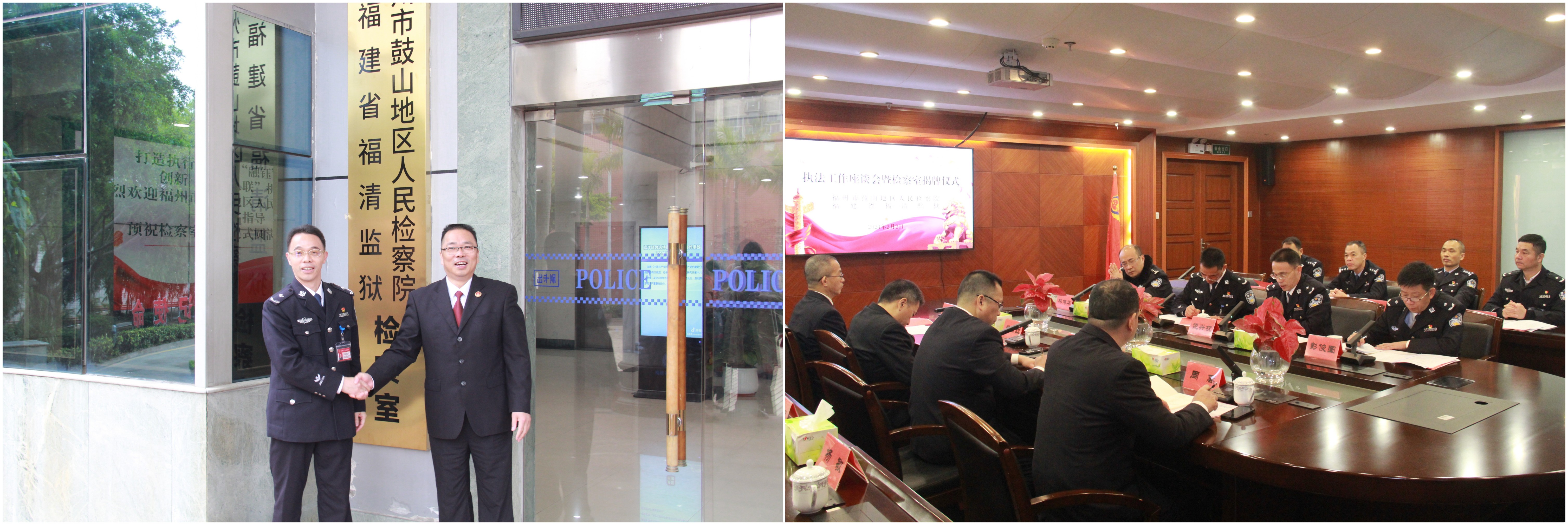 2月2日,福清监狱与福州市鼓山地区检察院召开执法工作座谈会,并举行驻监检察室揭牌仪式。福州市检察院党组成员、鼓山地区检察院分党组书记、检察长吴诗疆,福清监狱党委书记、监狱长饶兴权出席活动并讲话,鼓山地区检察院分党组班子、福清监狱党委班子和检监双方相关负责同志参加活动。