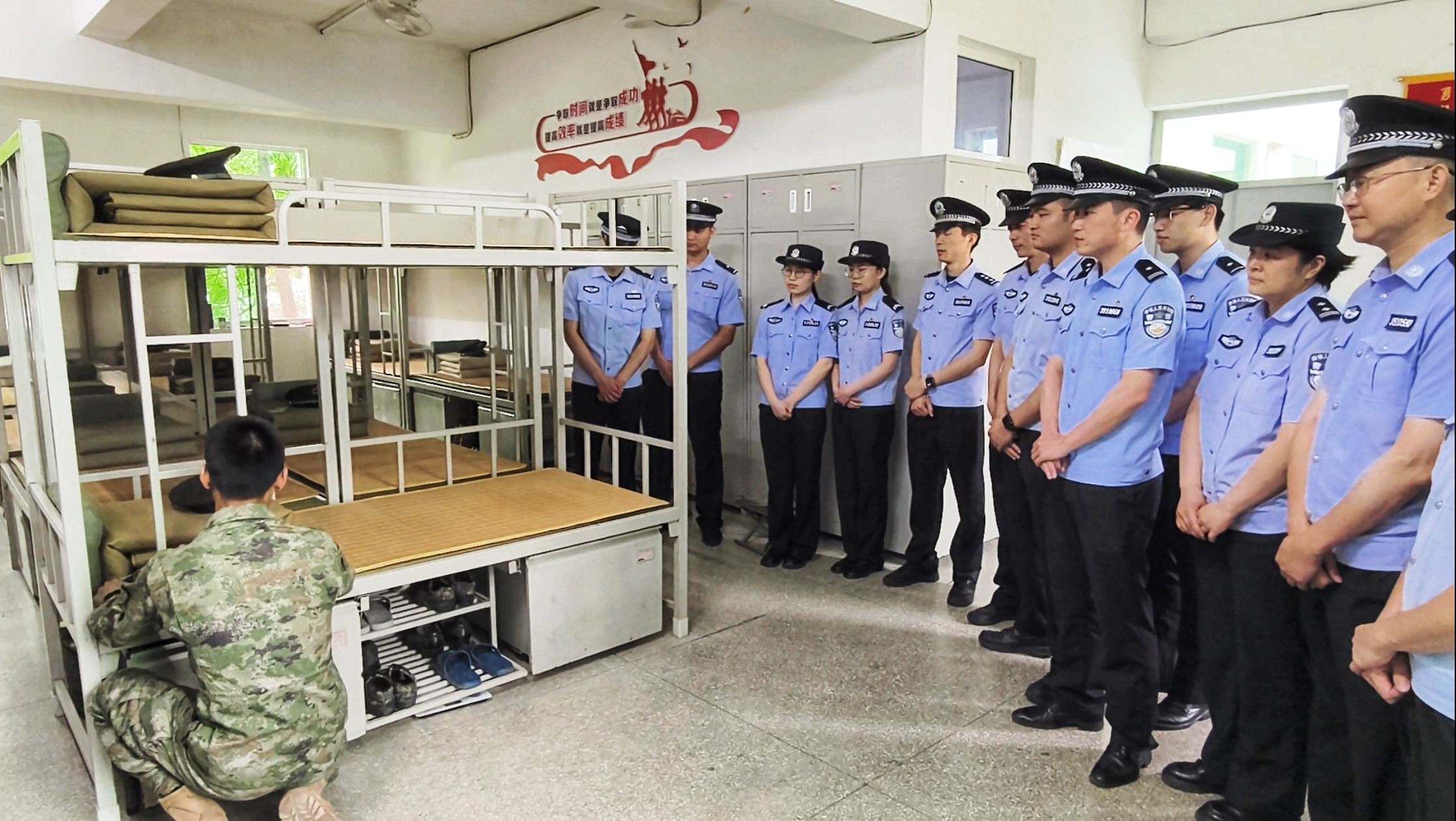迷彩绿的军装“爬满”训练痕迹但整洁笔挺、青草绿的“豆腐块”有棱有角平整如新、解放绿的军帽规范摆放整齐划一…… 走进“红色尖刀连”营房,青年民警情不自禁竖起大拇指。班长亲自上阵,演示内务整理操作规范,为青年民警上了一堂生动标准的“示范课”。连队指导员说:“内务就是战斗力,要在内务风纪上重细节、下苦功、促养成,这是塑造过硬作风、提高队伍战斗力的关键。”