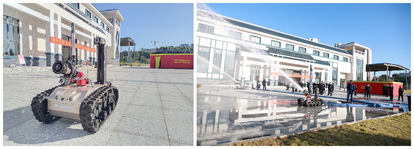 礼堂前广场上,四条蓝色的水带鼓起长龙连接消防机器人,在马达轰鸣声下蓄势待发。现场,消防战士为大家演示了机器人行进、灭火等各项先进技能,随后,大家有序进入浓烟滚滚的模拟逃生屋,体验了一场真实的“火场游戏”。在设备展台,广大民警职工在消防战士的指导下,饶有兴趣地测试手动报警按钮、消火栓报警按钮、消防电话等报警设备及防烟面罩、灭火毯的使用。“起火了,大家快使用灭火器灭火。”随着火盆及油桶燃起的熊熊烈火,民警职工快速抓起灭火器扑拉出插销,热情地投入扑灭初起火灾演练中。
