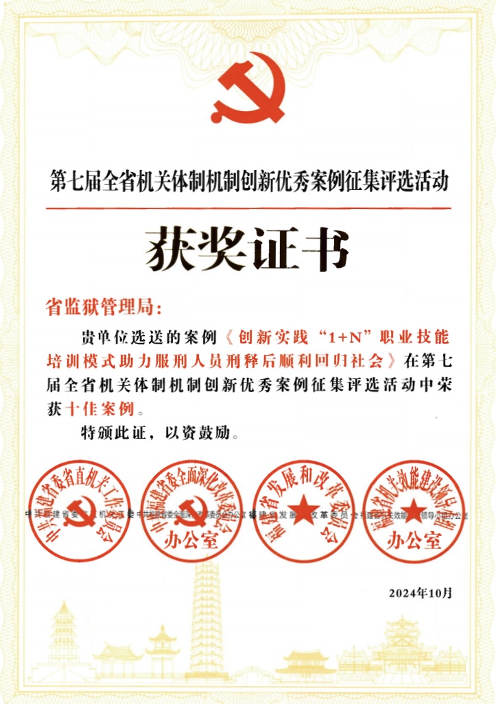 近日,第七届“推进机制活 建设新福建”全省机关体制机制创新优秀案例征集评选活动结果公布,省监狱管理局选送的《创新实践“1+N”职业技能培训模式助力服刑人员刑释后顺利回归社会》获评非党群类“十佳”案例。