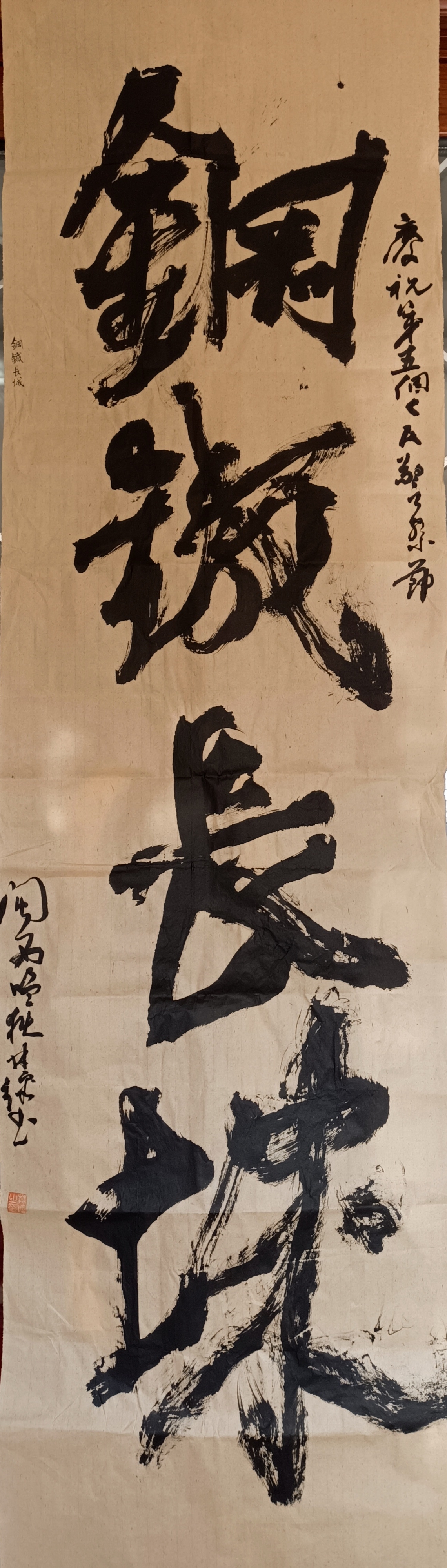 钢铁长城六尺对开作品,取法明清一路大字榜书,端庄大气,字势雄强。既有正书的稳重,也不失行草书的流动飘逸。整体效果采取“收放收放”的章法形式。