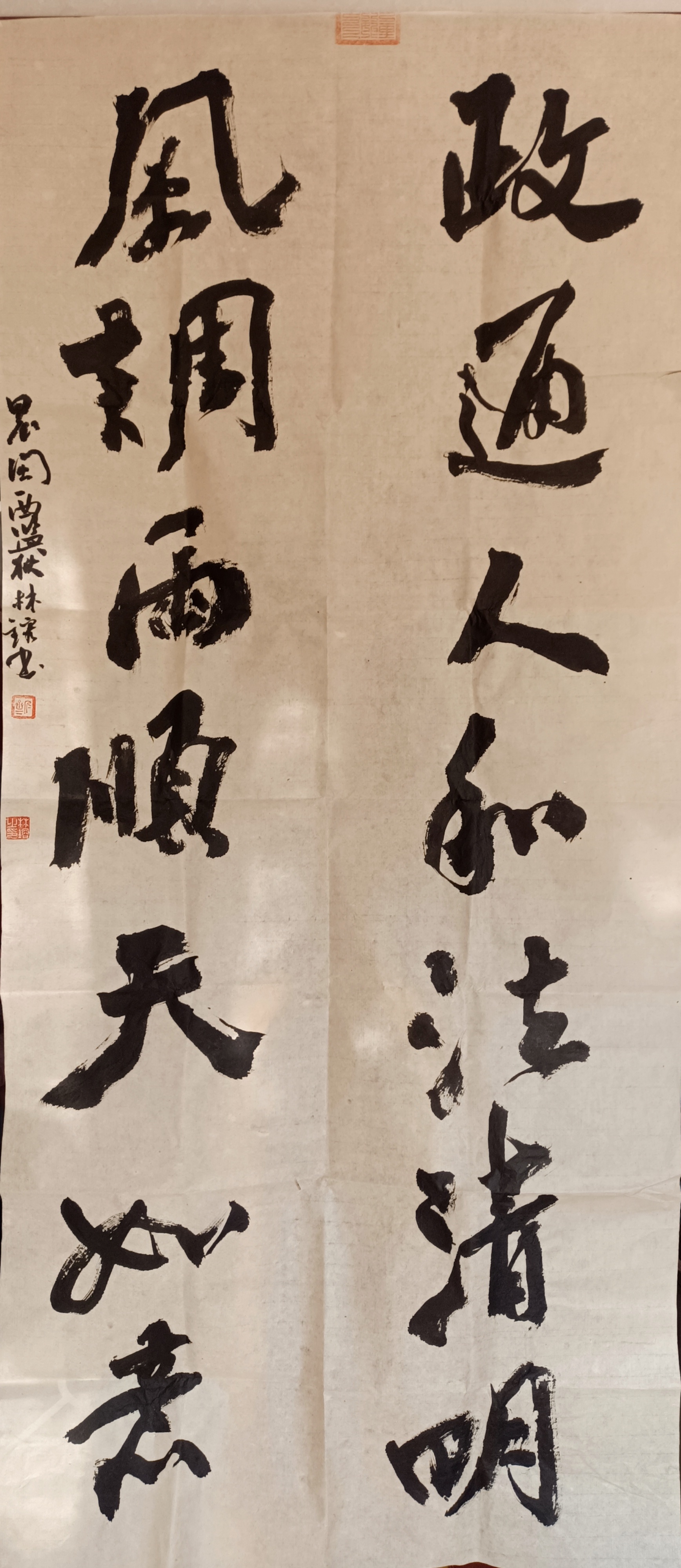 “政通,风调”联是一副司法行政法治对联,将法治宣传、法治文化与书法艺术紧密结合在一起。作品整体气韵畅通,大小交错一气呵成。反映了对政通人和、和谐社会、百姓安家乐业的美好祝福!