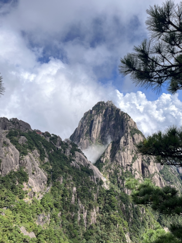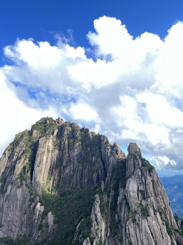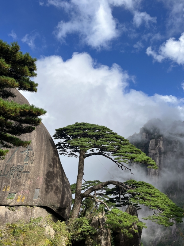峭壁之上,迎客松破石而生,虬劲枝干如老者苍劲手臂,舒展着千年的风霜与孤傲。墨绿松针凝着云雾清露,风过之时,似含笑意轻摇,邀山间流云、峰巅旭日共赏春山。