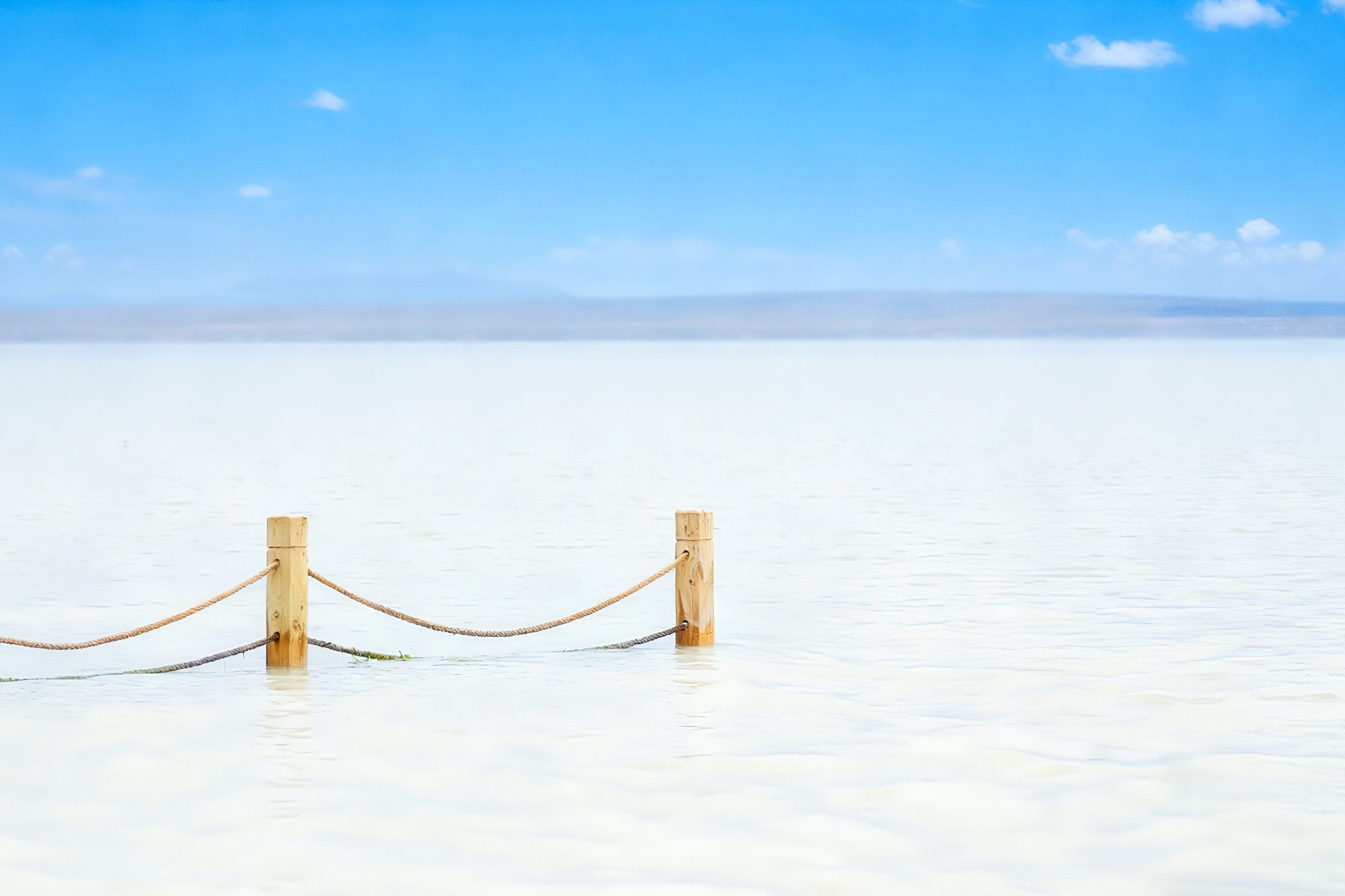 向东驱车数百公里,太仆寺旗的那潭“牛奶湖”撞入视野。淡蓝与乳白交织的水面如揉碎的月光,湖边两根原木桩斜斜立着,绳结在风里轻晃,倒像给这汪纯净加了道自然的注脚。