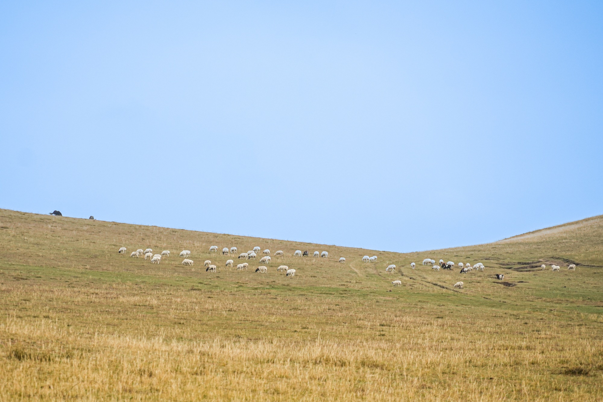 缓坡山丘如大地的褶皱,黄绿草甸间,车辙印与兽道若隐若现。无数“小白点”在草浪里跃动——是羊群。它们散落在缓坡各处,像被风撒落的珍珠。