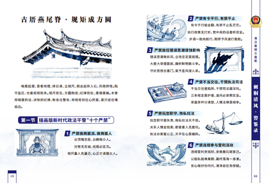 翻开手册,浓浓的闽南特色。“穿警服,担使命;守规矩,行要端;党的话,记心内;为人民,心要专”等闽南语三字经朗朗上口,既保留了方言的韵味,又传递了从警初心;红砖古厝的插画配上警察元素,传统拍胸舞动作与警察礼仪相结合。“我们深入挖掘闽南文化中的廉洁元素,把红砖建筑的‘出砖入石’精神比喻执法工作的严谨扎实,用东西塔的千年屹立象征民警的政治定力,借老榕树的盘根错节寓意队伍的团结协作。”民警介绍道。